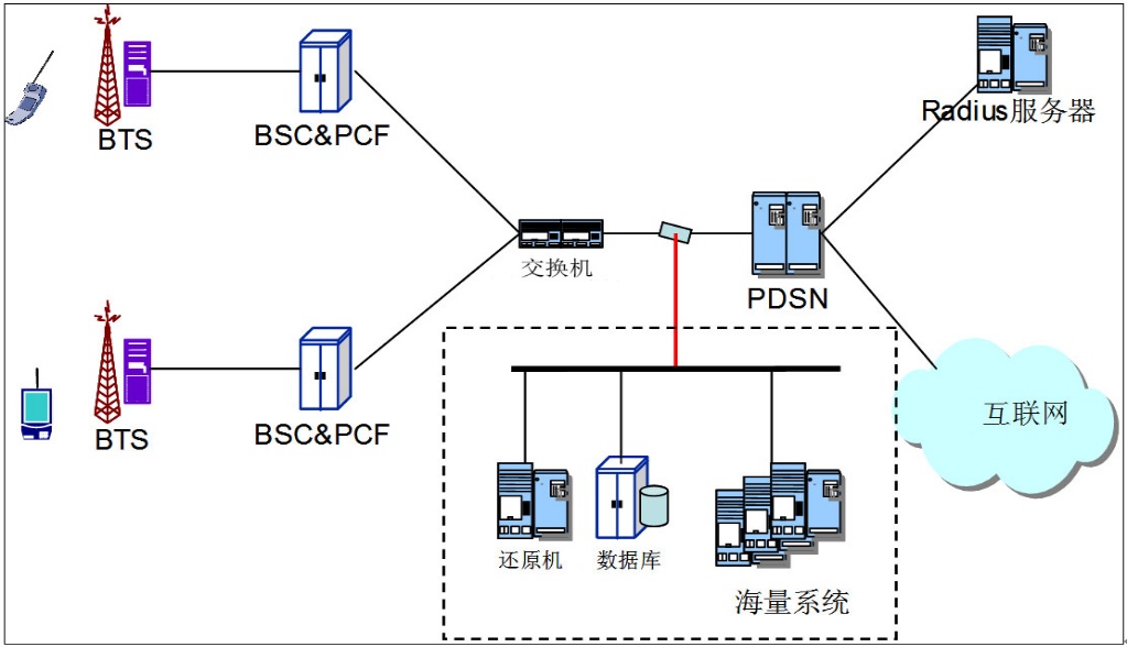 3G/LTE業務采集系統部署在網關后端(網關后端是指在網關偏向移動核心網一側部署),這樣可以獲得比較完全的數據,而且不需要Radius接入點。在網關后端可以捕獲到IMSI、用戶IP地址、PCF和PDSN地址、用戶上線時的BSID小區號、用戶的ESN號、用戶上線時間、用戶下線時間,以及訪問的互聯網的內容。