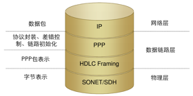 40G POS采集器用于城域鏈路或廣域鏈路中Packet Over Sonet/SDH的流量采集、過濾、分流設備。40G POS采集器的輸入流量為OC768(STM256)鏈路,實際鏈路容量39813.12G bps。 從IP層到Sonet/SDH的基本封裝結構如圖1所示。40G POS采集器基本功能是從SDH的幀中進行層層剝離,提取出IP報文,然后對IP報文執行多元組過濾,根據多元組過濾的結果指定輸出的端口(可跨板)、指定輸出的MAC地址,同時攜帶匹配ID等信息將10G以太網報文輸出到后端分析系統。