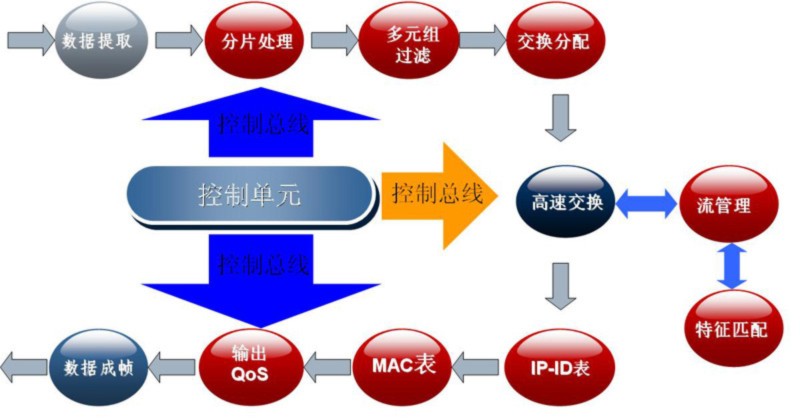 如圖2所示,RT1280設備的處理流程為:流量接收→數據提取→多元組過濾→交換分配→高速交換(交換控制卡)→IP-ID表→MAC查表→輸出QoS控制(10G線卡)→數據成幀→流量輸出。在進行DPI時,通過高速交換進入流管理和特征匹配過程,然后再通過高速交換執行輸出。