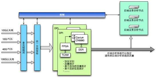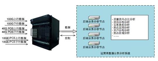 2、解決方案當前電信骨干網絡大量采用40G POS、100G以太網技術,對于海量的流量,不適合采用大量的服務器做集群來解決協議識別、協議流量統計等工作。隨著骨干鏈路的不斷擴容,數據業務分析廠商會將越來越多的精力放到如何提高接收的速度、統計的速度。而當基于流的數據統計、協議識別等工作在高速前端完成時,將減輕后端數據分析系統壓力。將數據業務分析系統廠商的精力和重點重新移回分析業務上。