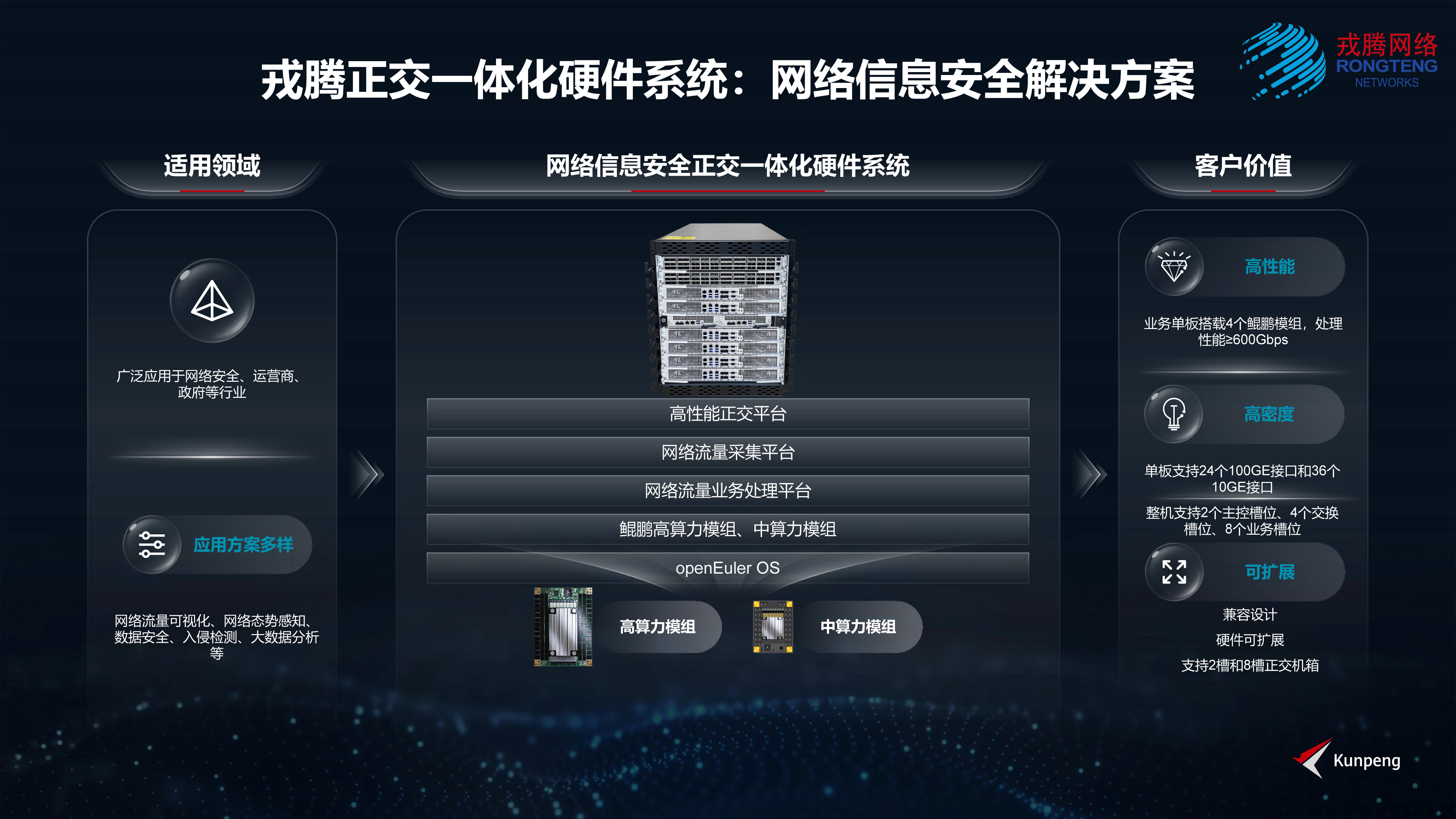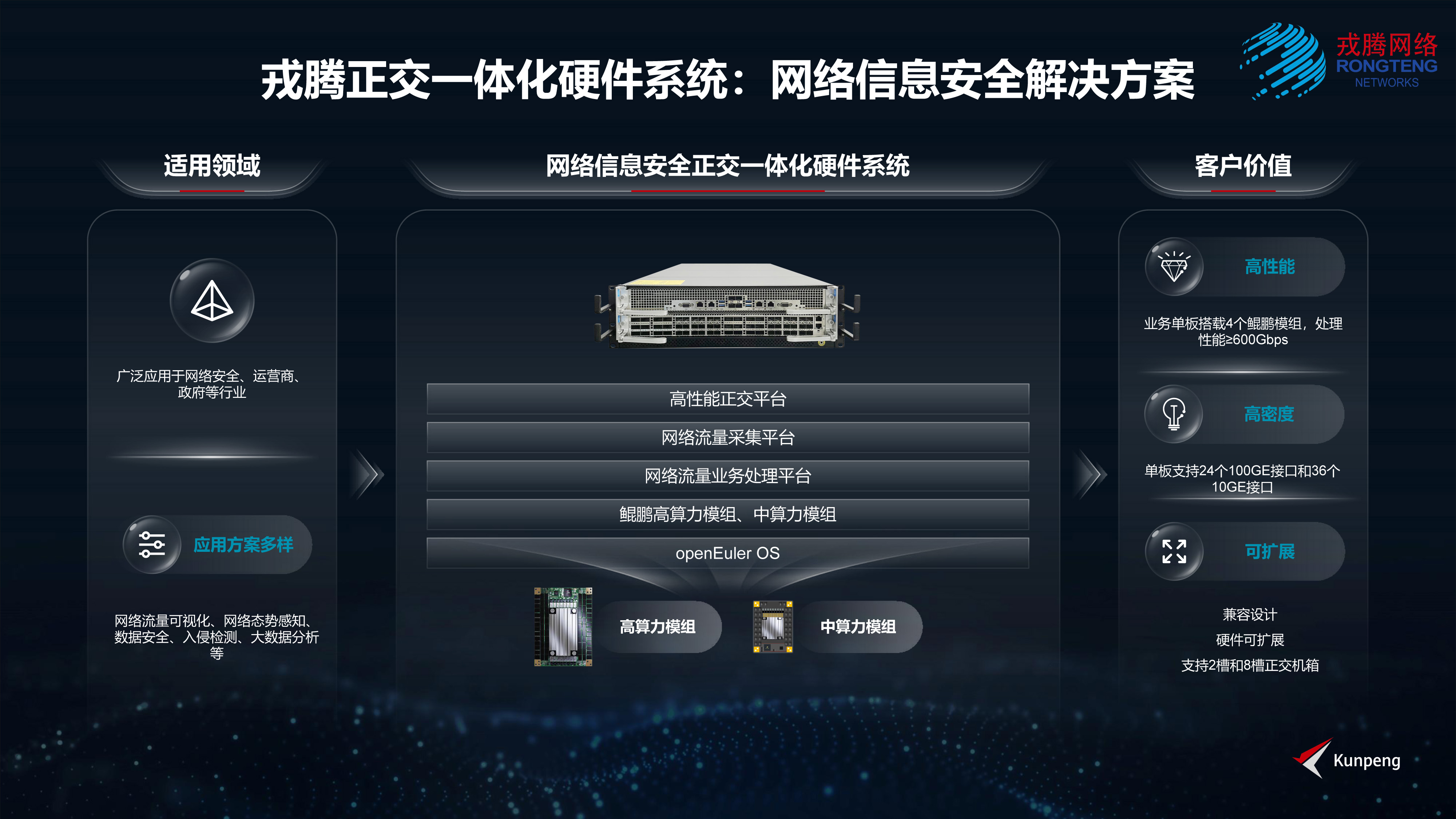 戎騰正交"網算"一體化硬件系統的計算業務板單板搭載4個鯤鵬高性能模組,具備高計算性能,網絡接口板支持24個100GE接口和36個10GE接口,擁有高密度可擴展能力,能廣泛應用于網絡流量可視化、網絡態勢感知、數據安全、入侵檢測、大數據分析等領域。